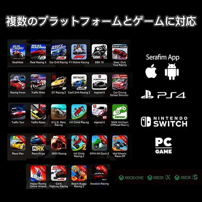 【複数のプラットフォームとの互換性】Serafim R1+ は、PS4、PS3、Xbox One、Xbox Series X&S、Switch などのビデオゲーム機もサポートしており、最大 9 つのプラットフォームと互換性があります。 簡単に言うと、スマートフォンとゲーム機の両方が完全にサポートされています。 現実のレース場で運転しているところを想像してみてください。